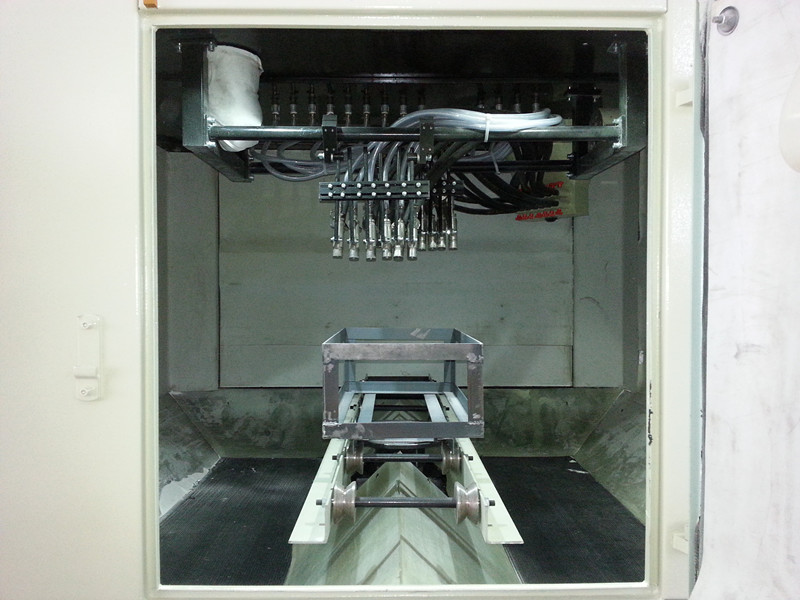 該機工作方式:將工件套裝在夾具(夾具客戶自制且安放于噴砂機主機艙內(nèi)轉(zhuǎn)動導軌上)上,推動夾具到指定位置,關(guān)閉所有艙門,啟動風機后即可開始對工件進行噴砂,噴砂時間結(jié)束(即當前工件已加工好),打開艙門,卸出工件;如此循環(huán)。